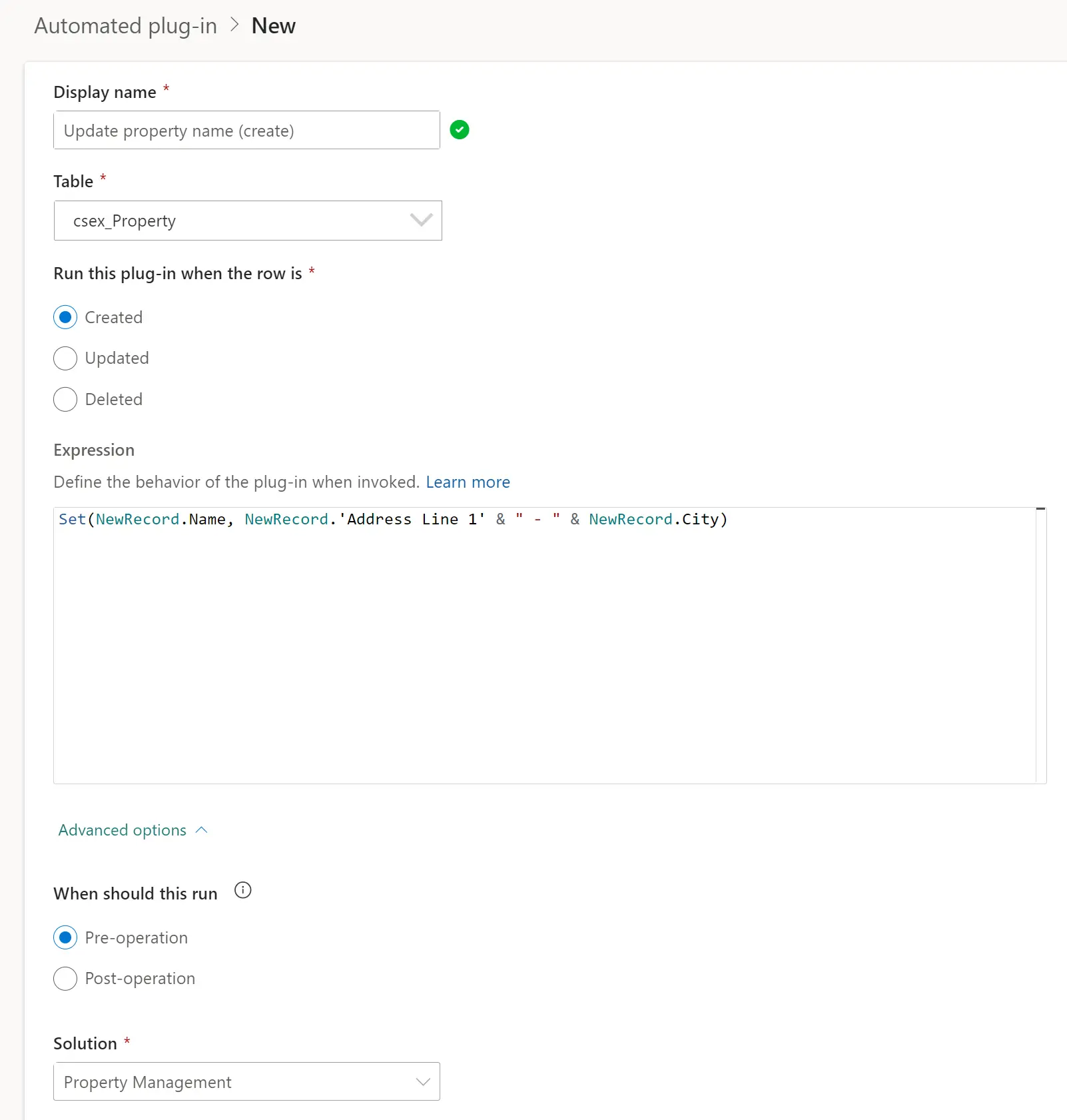 For my example use case, I have Properties (buildings) and I want their primary name to contain both the first line of the address and the city, so the display name for my plug-in is going to be Update property name (create).