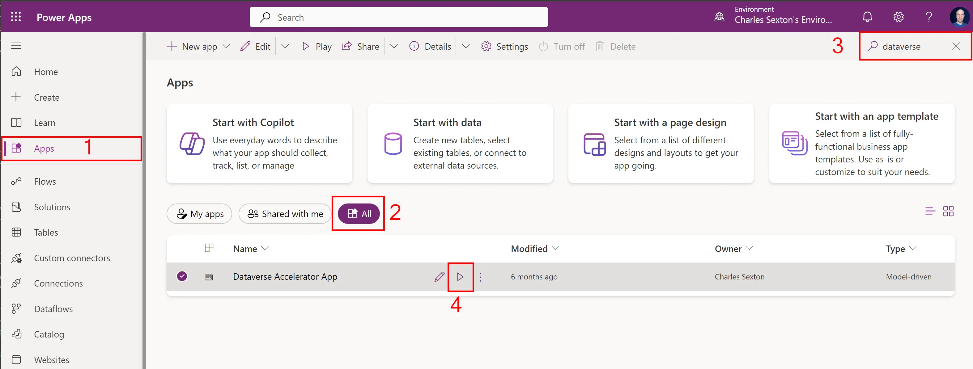 Once you've updated the app, open it by going to make.powerapps.com → Apps → All → Search for the app → Play