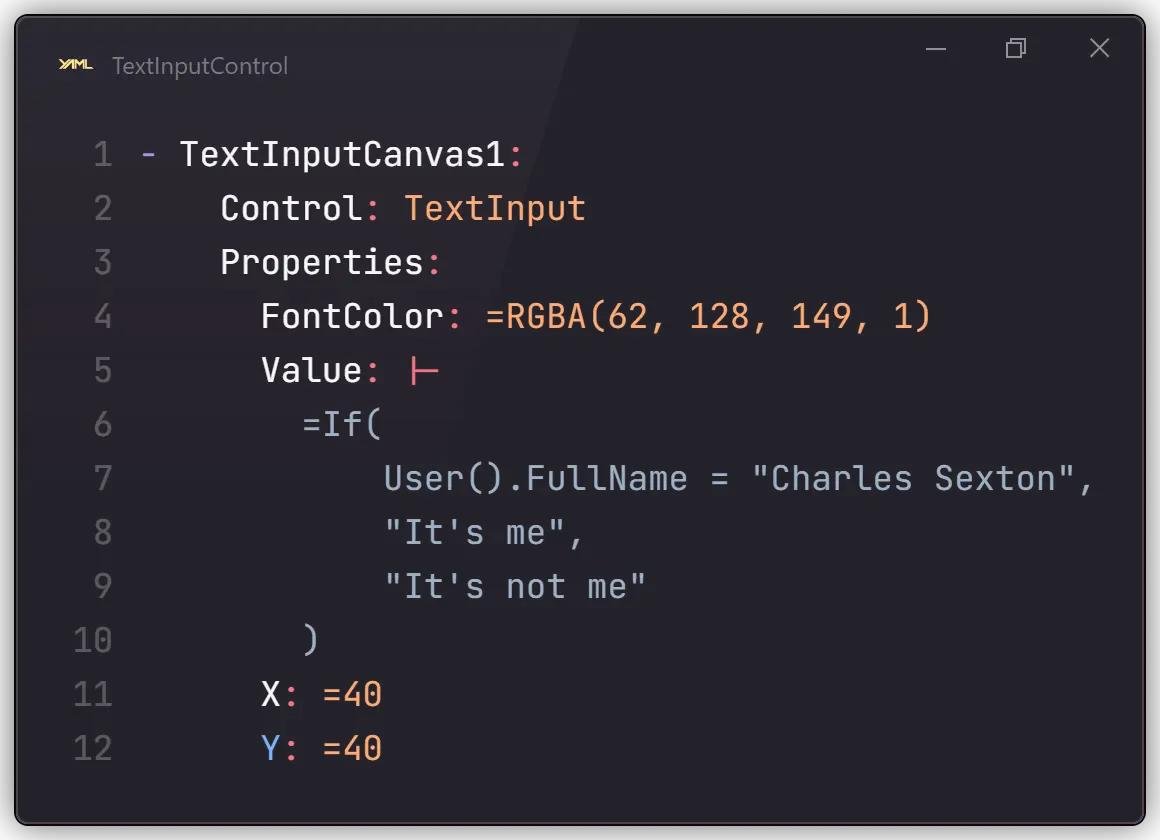 It might look a bit daunting, but this is just a text control with a font colour, some Power Fx to figure out what to display, and the X and Y properties.